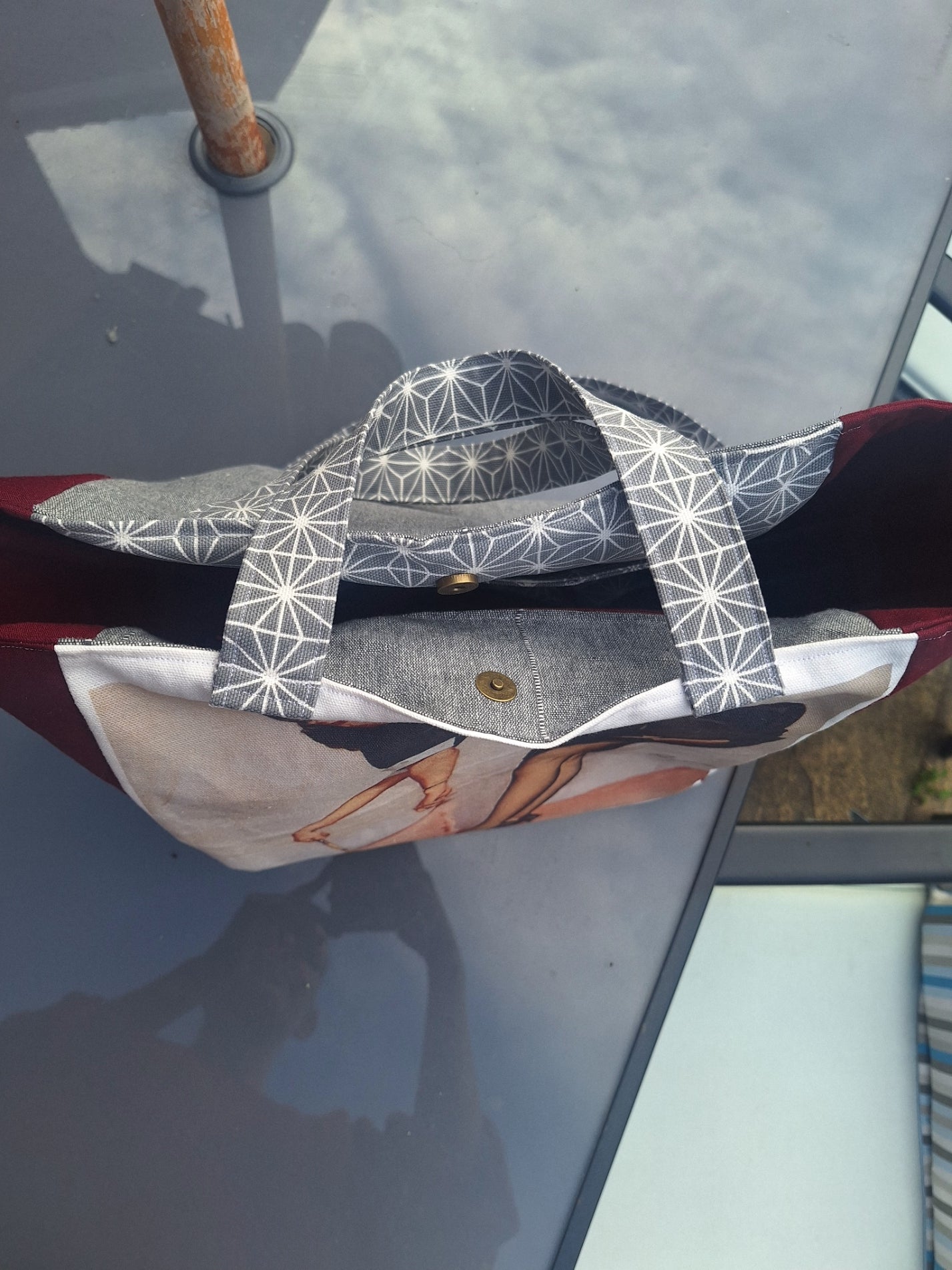 Turn heads with this bold, retro pin-up tote bag, handcrafted from a vintage pin-up fabric panel sourced from a second-hand shop years ago, paired with upcycled grey pillowcase fabric rescued from a charity shop basket. This bag combines 1950s-inspired glamour with eco-conscious, sustainable craftsmanship.
